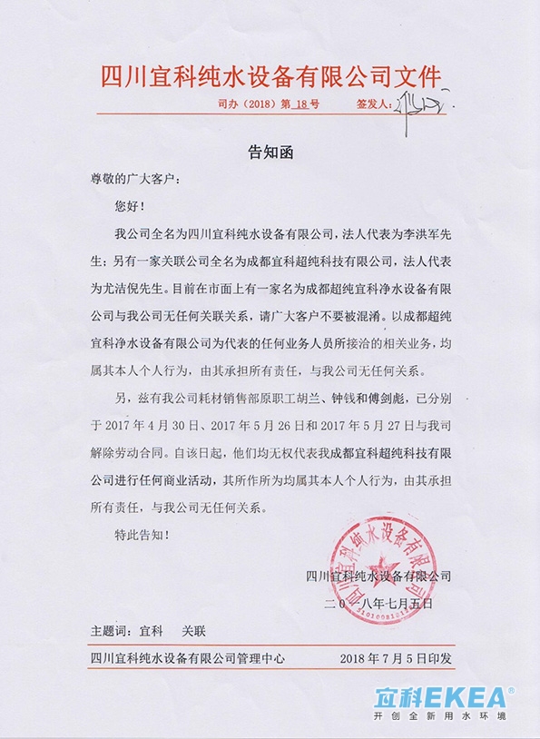 我公司全名為四川宜科純水設(shè)備有限公司,法人代表為李洪軍先生;另有一家關(guān)聯(lián)公司全名為成都宜科超純科技有限公司,法人代表為憂潔倪先生。目前在市面上有一家名為成都超純宜科凈水設(shè)備有限公司與公司無(wú)任何關(guān)聯(lián)關(guān)系,請(qǐng)廣大客戶不要被混淆。以成都超純宜科凈水設(shè)備有限公司為代表的任何業(yè)務(wù)人員所接洽的相關(guān)業(yè)務(wù),均屬其個(gè)人行為,由其承擔(dān)所有責(zé)任,與我公司無(wú)任何關(guān)系。