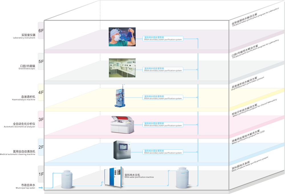 無論清洗消毒機(jī)、血液透析機(jī)、內(nèi)窺鏡、口腔設(shè)備、全自動(dòng)生化儀、實(shí)驗(yàn)分析等用水儀器是在一座大樓的同層或不同樓層,還是在不同的大樓,宜科均可配合最合理管路路徑與之實(shí)現(xiàn)無縫連接,通過管路同主供水系統(tǒng)相通,形成自動(dòng)循環(huán)完成水的初級(jí)處理和儲(chǔ)備,再通過各后處理系統(tǒng)完成水的分質(zhì)分級(jí)處理,滿足不同用水設(shè)備對(duì)水質(zhì)需求的不同。